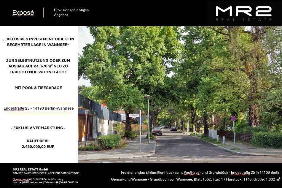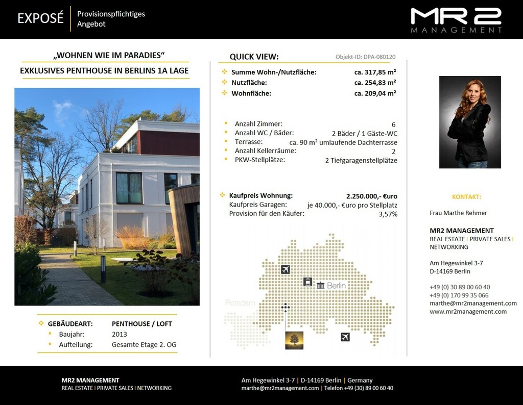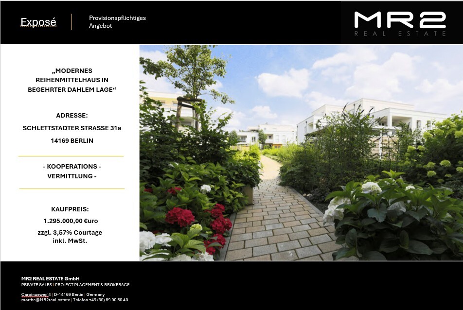 Bereits seit 2011 verbindet das etablierte Netzwerk von MR2 REAL ESTATE Käufer und Verkäufer, Anleger und Investoren erfolgreich mit privaten Verkaufsmöglichkeiten von Immobilien und anderen Investitionsoptionen hauptsächlich in Berlin, aber auch in ganz Deutschland und in Europa. Unzählige Immobilien, die die MR2 REAL ESTATE in diskreter und / oder in der Exklusiv- Vermarktung betreute, wechselten seitdem bereits zufriedenstellend ihren Besitzer. Nutzen auch Sie die vertrauensvolle Betreuung bei ihrer Immobiliensuche oder bei ihrem Immobilienverkauf - wir sind gerne für Sie da.
